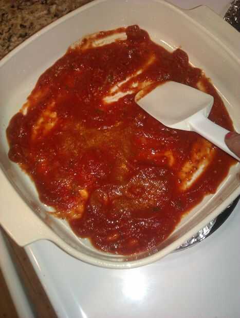 Repartidas alrededor de 1/2 taza de la salsa de la pasta en parte inferior del plato de la hornada.