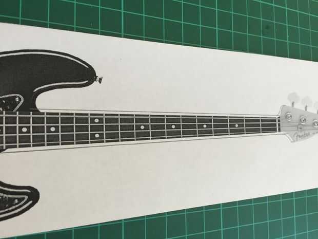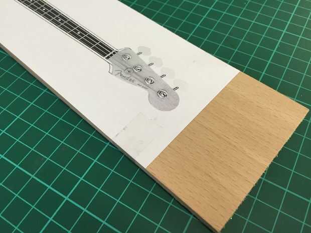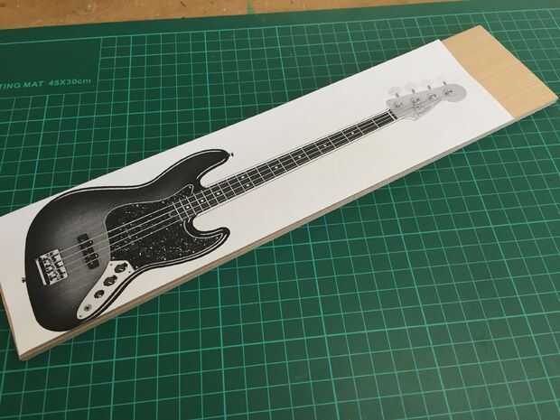 Agradezco a google por una foto de un bajo jazz fender (sí, lo reconozco, soy un hombre bajo) y escala con el tamaño correcto (75mm de ancho). Después de imprimir la imagen, me ajusta la anchura del cuello para hacer la espátula un poco más robusto y graba la imagen en la tira de madera.