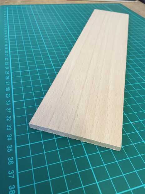 Haya es una madera muy buena para utensilios de cocina, ya que los agentes de curtido no plantea problemas o malos aromas mientras se cocina. Por otra parte, el hinchamiento y contracción debido a la humedad no deben ser suficiente para romper la madera. Me planeado tiras de haya hasta aproximadamente 4,7 mm de espesor y miré por una parte en la que el grano está en un ángulo de 45 grados con respecto a la superficie (Esto ayudaría a evitar desgarros en la espátula).