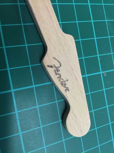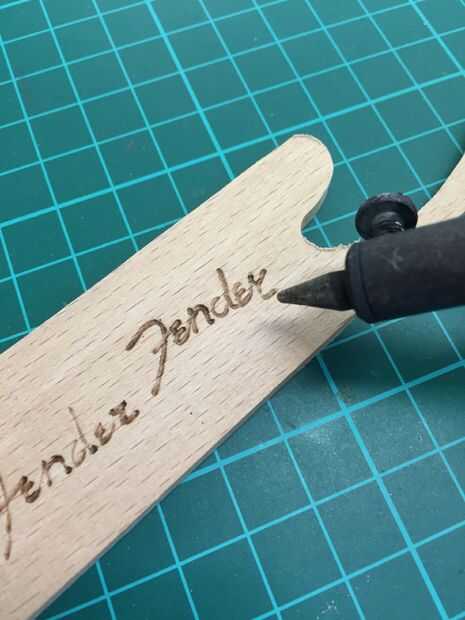 Me gusta gadgets simples y discreta, pero resistirse a couldn'r para agregar el logo de fender en la cabeza del bajo. He probado mi marca de hierro en algunos trozos de madera de haya y dibujó el logo en lápiz en la espátula. Una vez que me sentí lo suficientemente seguro, marca el logo de fender en la madera.