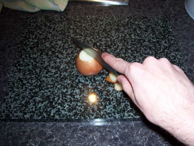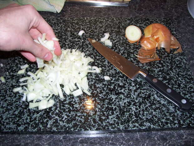 Lo corté mi cebolla es superior y la cola (de corte superior e inferior), sentarse en uno de los extremos y cortar por la mitad, ahora solo Pele la piel y picarla!