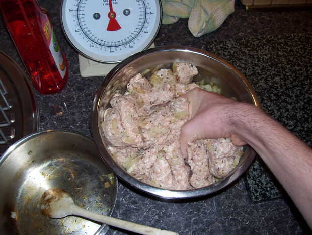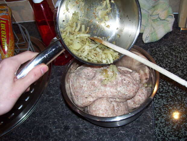 Ahora, punta de la carne en el tazón grande y tus cebollas de antes en, dan una buena mezcla de chuck, así puede utilizar sus manos como vas a tener que en el paso siguiente de todos modos!