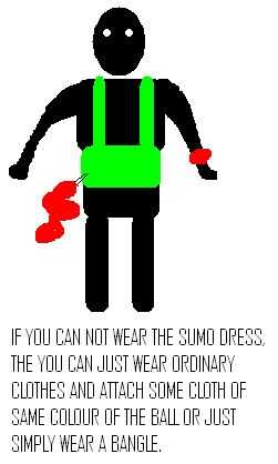 2. equipo de A se lleva los trajes de lucha de sumo de diferentes colores o si no es posible entonces puede usar cualquier ropa cómoda con algún paño de los colores de las bolas