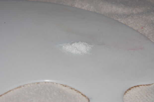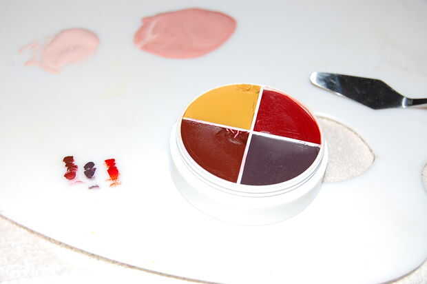 En cambio, sacar la pila de la lesión y, utilizando la espátula limpia, raspar una muy pequeña cantidad de rojo, marrón y berenjena en la paleta. Sólo necesitas un poco más. También colocar una pequeña cantidad de talco en la paleta.