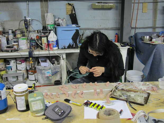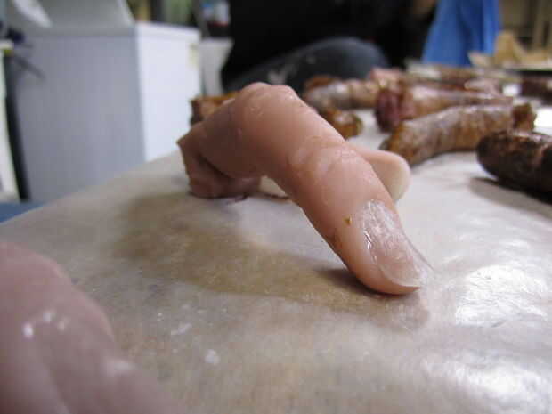 hace algún tiempo hicimos un trabajo para un programa de televisión de zombies; nos pidieron hacer una ración colmada de barbacoa sería "lady fingers" para que una familia de zombies podría chow abajo en la mesa. Los requisitos eran que los dedos, parecía que la "piel" rasgaría lejos (como piel de pollo de goma) para revelar los huesos del nudillo y que sería alimento seguro para los actores. Para la vida de mí no puedo encontrar las fotos del proceso pero tropezar a través de las fotos del producto final, además el video dorky uber que envié al director de arte para mostrar cómo funcionaban los dedos. No construyo Tina y especial fx superestrella James VDK tomaron el trabajo, pero pensé que mostrar a ustedes cómo resultó.