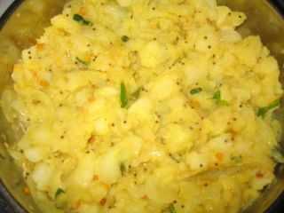 4 fríe hasta transparente, añadir la cúrcuma y la sal. Ahora agregue los grumos del puré de patatas, cocido de chícharos y zanahorias. Mezclar, espolvorear 3 cucharadas de agua y dejar cocinar con tapa a fuego medio durante 3 minutos. Apagar el fuego y ajustar de sal.