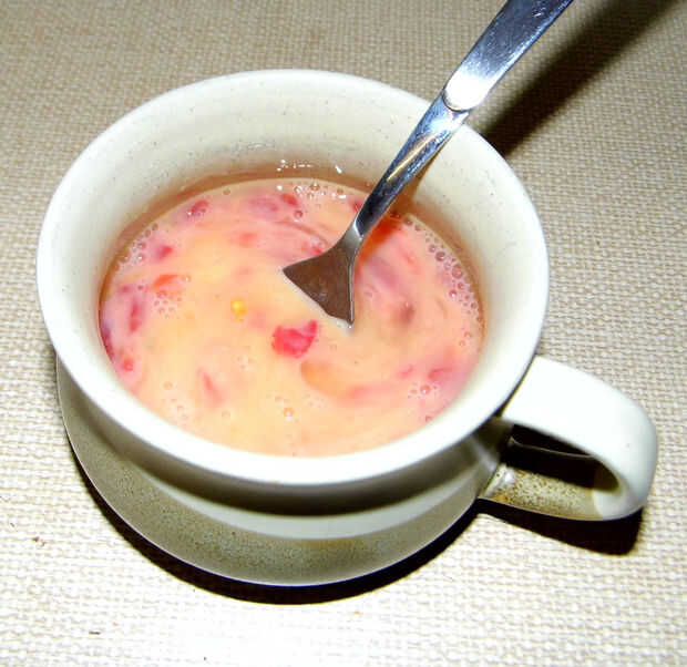 Batir dos huevos y añadirle los tomates picados. (agregar sal)