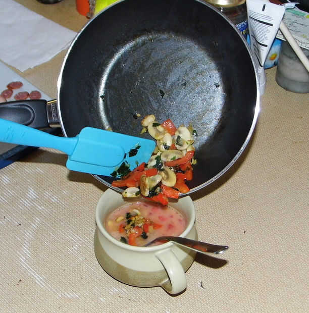 Cuando la cebolla, perejil, pimiento y champiñones oro/marrón añadir a la mezcla de huevo/tomate y mezclar bien.