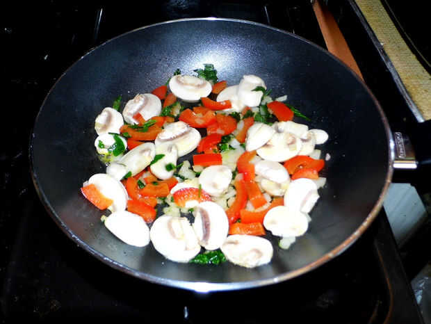 Empezar friendo cebolla, perejil, pimiento y champiñones. (agregar sal)