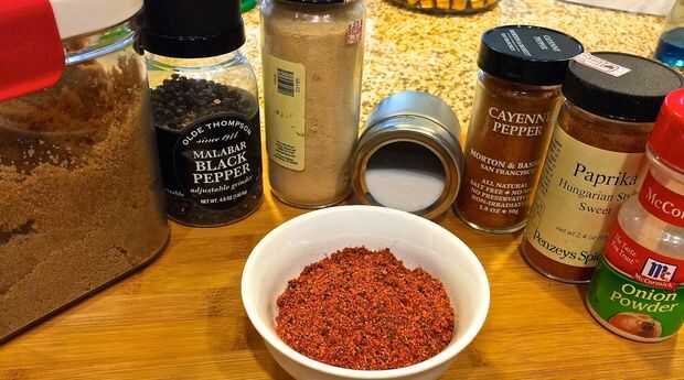 Frote el sazonador de especias sobre las costillas antes de cocinar, el sazonador de especias forma una capa sobre la comida. Las costillas pueden ser marinadas en especias hasta 2 horas antes de cocinarlas, algún tiempo para que los sabores incorporar a la carne o pueden ser cocinado inmediatamente después de que está revestida en la frotación.