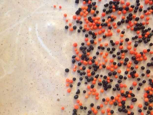 A continuación, espolvorear la superficie de la melcocha uniformemente con las chispitas de nonpareil. Dejar endurecer durante varias horas hasta que esté firme.
