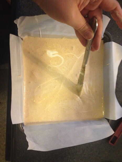 Use el mango de un tenedor para agitar suavemente las dos capas de melcocha juntos.