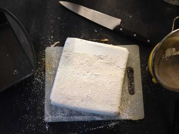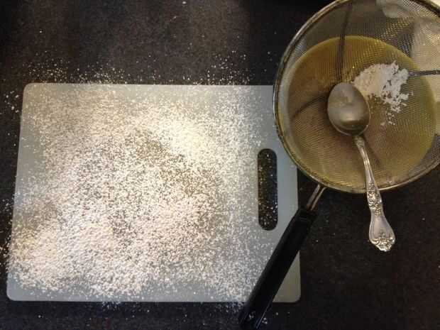Utilice una pasta cepillo apagado exceso de azúcar en polvo por el lado de espolvorear de las melcochas.