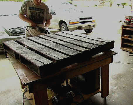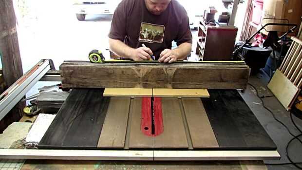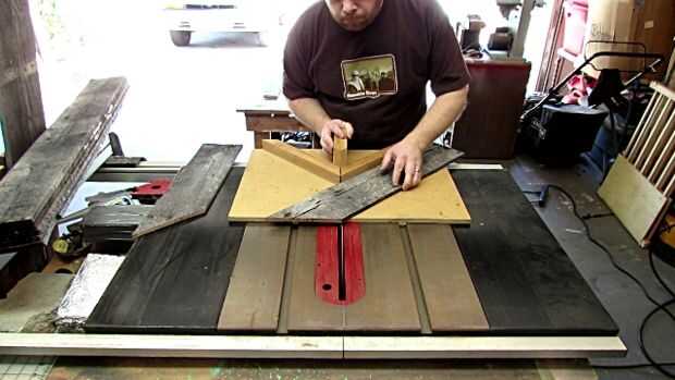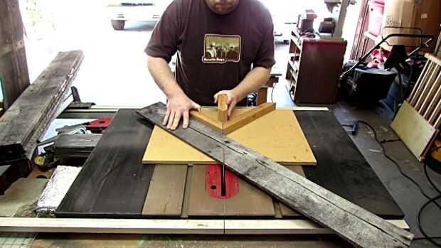 Una vez que tuve todas las tablas que quitado marcó mi centro al lado de cada uno. Quería hacer una especie de patrón de tipo espina de pescado con ellos hacia arriba. Luego utiliza mi trineo de inglete de 90 grados con mi sierra de mesa y cortarlas por la mitad con la coincidencia de ángulos para obtener el patrón que tenía en mente.