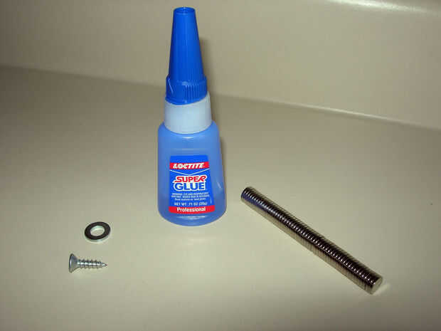Pasamos por muchos tipos diferentes de pega tratando de encontrar uno que funcionó bien de metal pegado al plástico. No quiero usar epoxi para evitar la mezcla. Nos decidimos por llano viejo pegamento de Krazy y luego Loctite Super Glue una vez que terminó la anterior. Ambos trabajaron como igual.