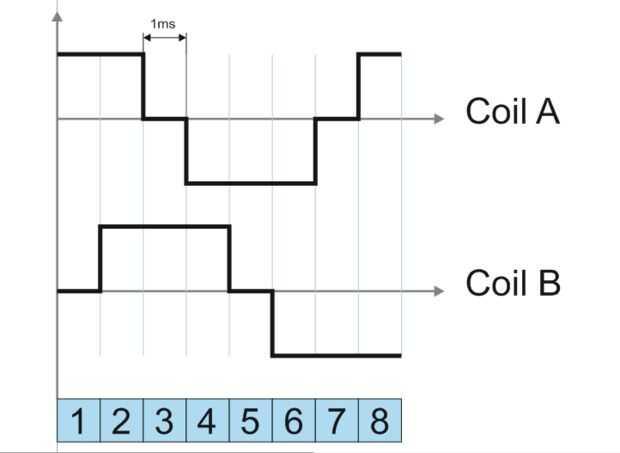 Como se muestra en la imagen que el algoritmo requiere la siguiente secuencia de 8 paso aplicada a ambas bobinas para que funcione correctamente. Cada secuencia tiene 8ms y mueve el motor 4 pasos (7,2 grados).