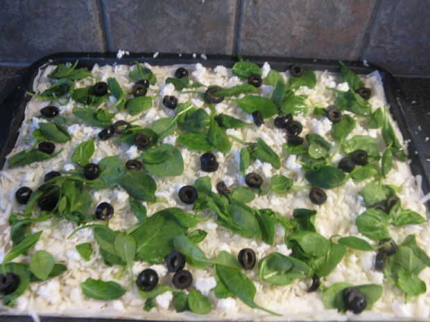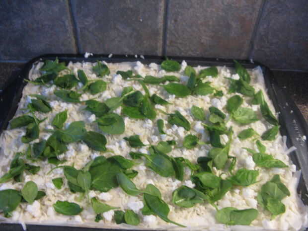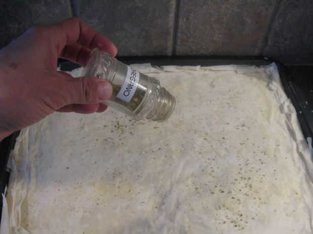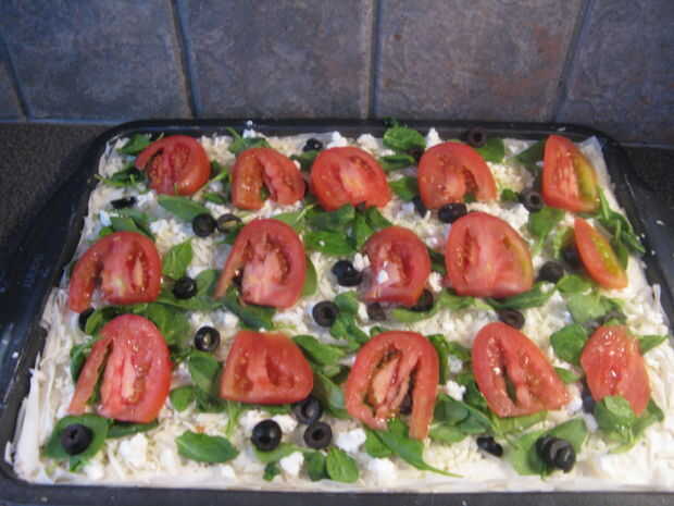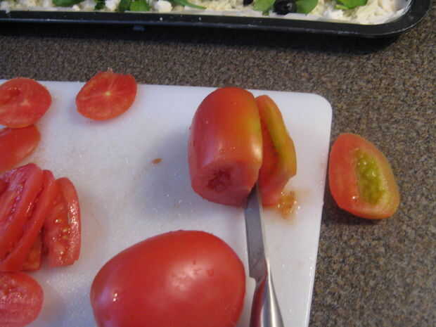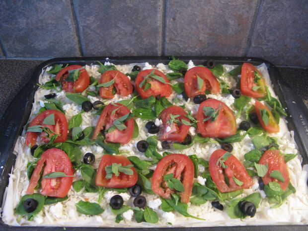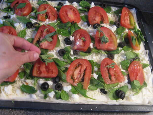 Coloque rebanadas de tomate en la parte superior, luego tapa con ramitas de orégano fresco (o tomillo, o Romero-sea cual sea su preferencia)