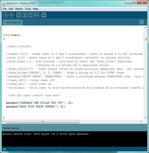 Pon tu código de control de láser aquí! void loop() ejecutar la demo de show de láser por defecto }