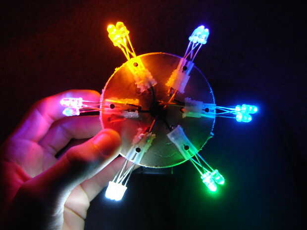 un pequeño pero poderoso con pilas luz de la noche. Seleccione de modos diferentes de color sólido o disco modo llamativo! También haría una luz excelente bicicleta. Construido a partir de 7 LEDs de color y un dot-it.Encontré estos LEDs comprando