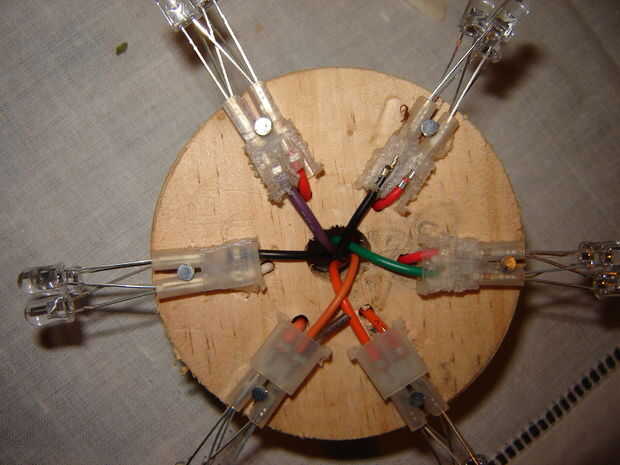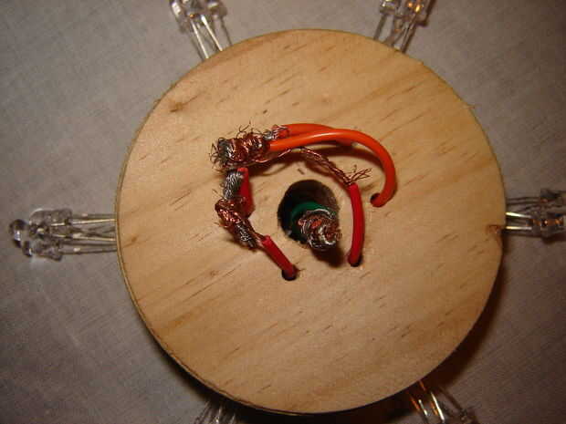 Lo mejor y lo más importante!!!!!! Tome el taladro y coloque el cortador del agujero de 3 pulgadas. Perfore un agujero. Una vez haya creado su tomar del círculo y marca cada 60 grados. Taladre un pequeño orificio de medio centímetro a la derecha de la marca y lleva puesto el positivo (rojo, naranja o blanco conduce) por ese agujero hacer un agujero más grande en el centro y correr el negativo. Todos los cables negativos trence y Únete a todos los negativos junto con el alambre como se muestra. Finalmente estos martillo hacia abajo con algunos clavos.