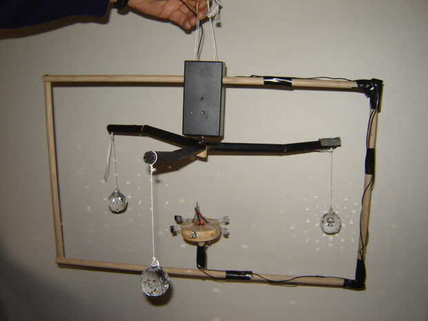 Ahora es el momento para apoyar y la estrella del LED de alimentación. Comience tomando el tubo de PVC o pasador y corte las dos piezas que son 60 cm aproximadamente. Crear otras dos piezas que son cerca de 38cm de largo. El siguiente es crear la pieza final que vendrá casi nivelada con los cristales colgantes. A continuación usted debe de adjuntar estas piezas como se muestra en el cuadro 2. Ahora fije la estrella llevó a la más pequeña pieza de tubo o madera que hiciste de último y cualquier clavo, tornillo o pegamento hacia abajo usando el medio del agujero (negativa conduce) y cambio el lío liado de cables a un lado. Ahora si se utiliza tubería de PVC puede conectar dos cables a los terminales y ejecutarlos a través del tubo. Si utiliza pasador ejecute los cables a lo largo y si lo desea, puede ser sostenidos con grueso, negro tubo termocontraíble que cubre los cables y todo madera. Ahora para que en lugar de seguir esto: Haz una broca del tamaño de la madera o tubo de PVC y taladre un orificio hacia abajo en el cuadro de manía como en la imagen. Perfore pequeños agujeros para los cables o correr a través. Sujete el tubo o abajo en su lugar y finalmente perfore un agujero del mismo tamaño que un gato de pequeña potencia. Esto es importante: averiguar qué parte de los puntos de tomas de corriente son positivos y negativos. Poner un alambre positivo para el motor y el LED en el (2 separar los cables y lo mismo para el terminal negativo.)