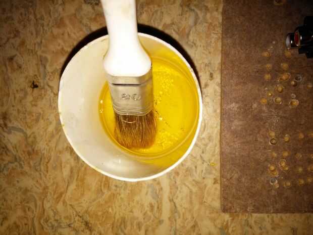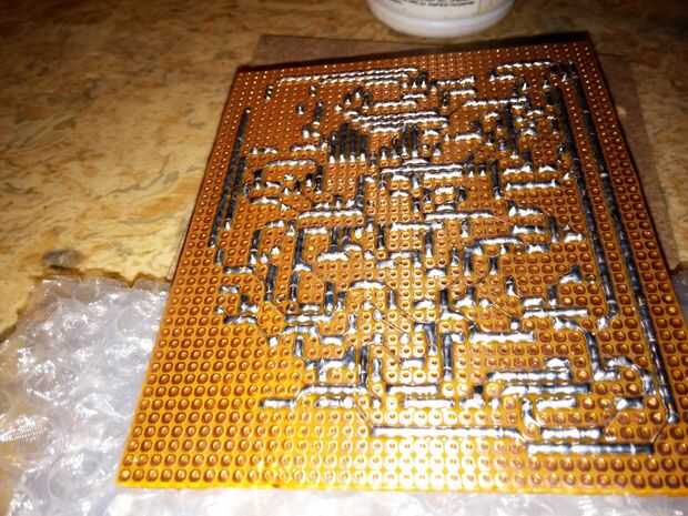 Esto se hace en el bote de plástico más fuerte (de una cola vacía de madera cortar el envase en el medio y dar la Copa) y vierta el más fino polvo de resina y remover con un cepillo largo que el polvo en plena descomposición, obtenemos el líquido es amarillo. Si vierte el líquido en un vaso de plástico suave, después de 1 minuto come desde la parte inferior, ya que prácticamente come cosas porque es corrosivo. Cuando tenemos un inferior engrasado del cepillo del circuito, dejar la capa se seca, así que enlaces damos protección contra la oxidación. La capa no es relevante al soldar, por lo que todavía se puede arreglar cualquier cosa.