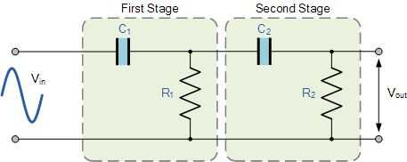La razón por qué esto funciona es que el voltaje en el condensador puedo de repente cambia. Podemos imaginar que el condensador de alta frecuencia significa un trozo recto de alambre (corto circuito). Condensadores DC real representan la pieza inferior de frecuencias dos de cable que no toque nunca que significa que tenemos un circuito abierto. Por esta razón no obtenemos la tensión en la salida.