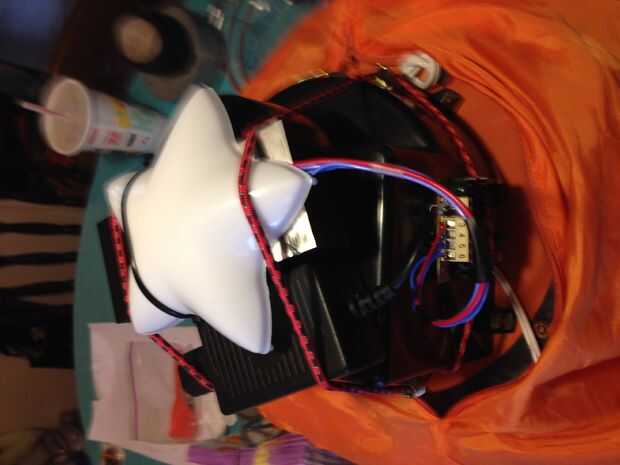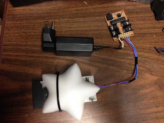 Usé una concha de estrellas de un armario de tienda de dólar luz como difusor. Solo cable atado en la parte superior de la Asamblea de LED. un par de cuerdas del amortiguador auxiliar mini mantenerlo todo a la caja del ventilador. la fuente de alimentación conecta el la toma de 110V de los viejos cables de cadena ligera.