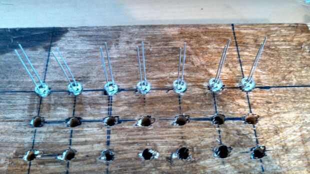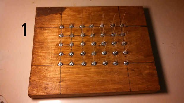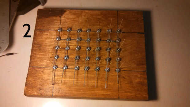 1. Voltee el bloque de madera y poner un LED en cada uno Coloque cada LED para que el conector de tierra se dirige hacia la esquina inferior izquierda de la pieza de madera.