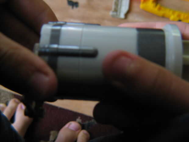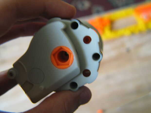 Tire los 5 postes naranja que. Invierta la pieza y saldrá el ARs y 5 pequeños manantiales. Usted no necesita tampoco tan hacerlo con ellos. Vuelva a colocar en los puestos de trabajo. Vuelva a montar el artilugio de cilindro (Foto 2). La pieza naranja en el extremo de libra en todo el camino. Coloque el cilindro en la pistola.