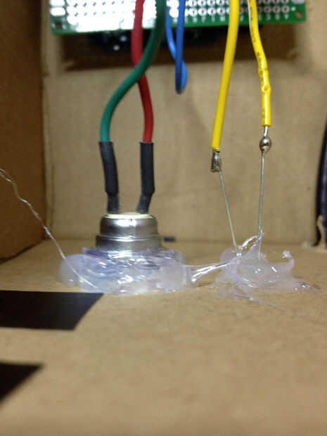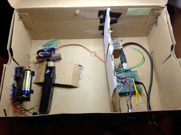 Creo que las fotos lo dicen todo y lo que no lo hacen la voluntad del mismo. Usted puede elegir poner hacia fuera un poco diferente pero es el mismo principio. La luz de la bombilla incandescente golpea el CD (red de difracción) pegado en caliente para el motor servo. Como el motor se mueve las diferentes longitudes de onda pasan a través de la ranura (dos hojas de afeitar) y la cubeta que contiene la muestra y entonces finalmente al detector (en este caso el fotoresistor).