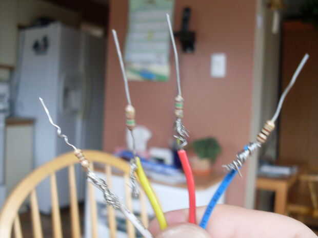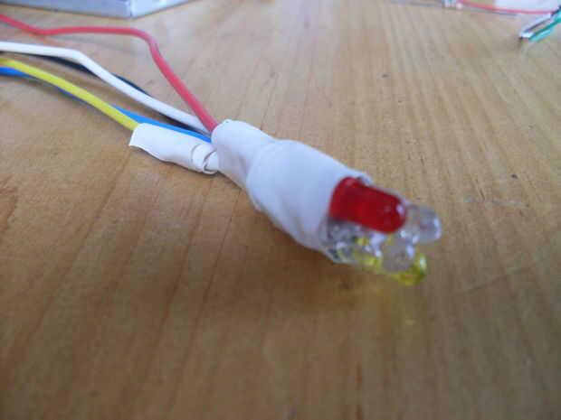 Lo primero que hice fue conectar todos los cables negativo de los LEDs a un solo cable y dio cada positivo su propio cable. Después de eso, al sus respectivos LEDs con las resistencias y utilizar cinta aislante para asegurarlo. (de soldadura se recomienda aunque no pude encontrar mi soldador)