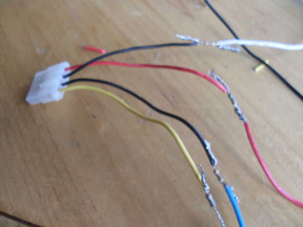 UGGGGG. Esto es terrible. Tuve la brillante idea de utilizar un conector de una fuente de alimentación de computadora. NO USARLOS! Uso cualquier cosa pero. No funcionó bien, pero fue todo lo que tenía alrededor. Cada positivo debe ir a su propio conector a través de las resistencias que atamos antes. Utilizar el número adecuado de conectores para el número de LEDs que tienes.