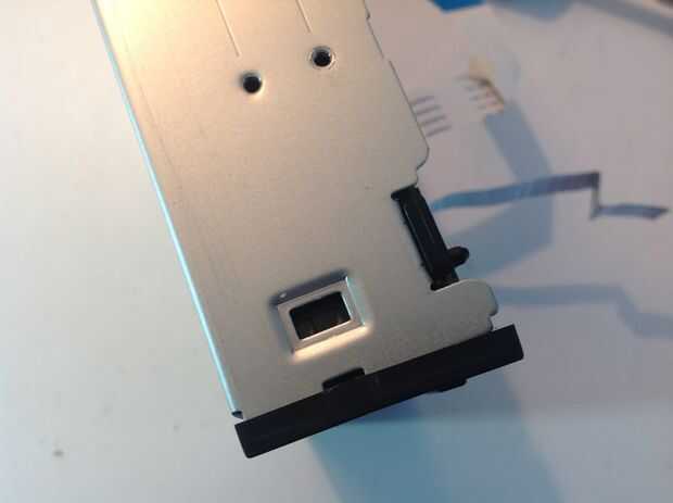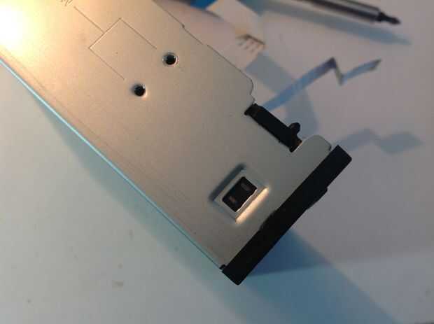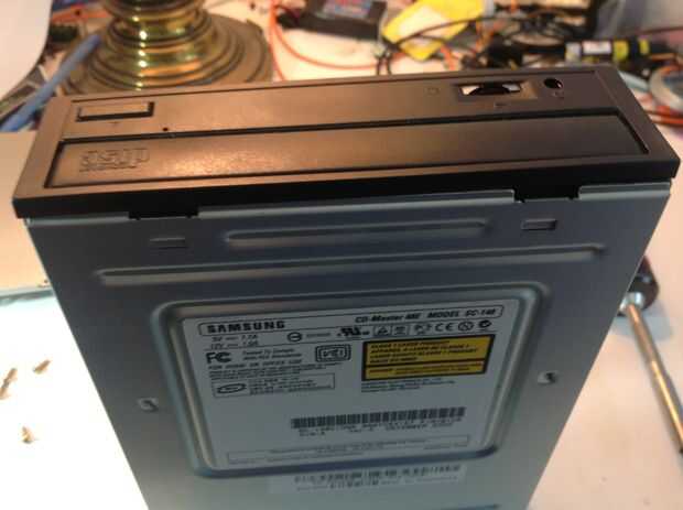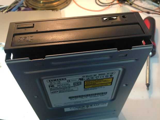 Muy simple conseguir un destornillador para empujar las dos lengüetas a cada lado de la unidad de disco, entonces usted debe poder a la unidad abierta de la parte superior. Sacar los tubos de metal; no necesitarás esto para el proyecto (a menos que desee usar como un montaje de 90 grados...) Puede ser un poco difícil en primer lugar despegar, pero si tratas de quitar si apagado y comienza a salir, podría simplemente un poco duro para sacar.
