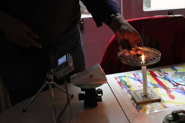 La fuente era común sal de mesa, pegada a una malla de alambre con alguna gota de agua y ahora arde en la llama de una vela.