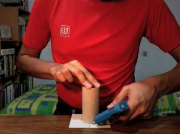 Fichas de lugar los dos sobre un extremo del tubo, creando una vertical la raja y utilizar pegamento caliente para pegar en el lugar.