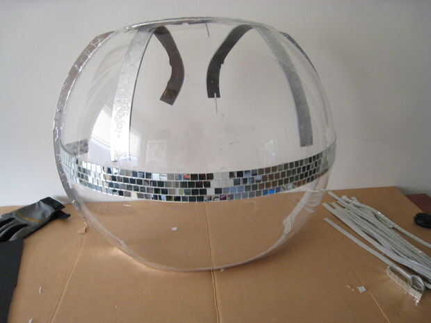 Cubrí los bordes filosos de los domos con cinta de espuma les almohadilla. Luego cubrí todos los bordes con cinta de plata, para disfraz, donde terminaron los espejos.