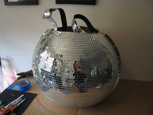 Colocación de la primera fila de espejos fue la más difícil. Empecé en el "Ecuador" de cada cúpula. Mi primer intento no era nivel, pero por suerte el pegamento caliente sacó limpiamente cuando decidí intentarlo de nuevo. Este tiempo también utilicé un nivel láser para asegurarse de que es un buen punto de partida. Luego empecé a pegar las tiras de los espejos encima del Ecuador, compensando cada fila en un patrón de ladrillo. Corté azulejos del espejo a la mitad (marcador les con un cortador) para rellenar las filas a cada borde.
