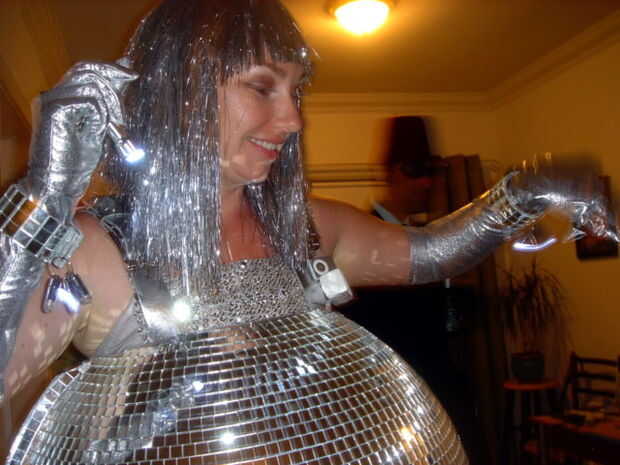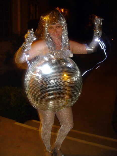 Compré mini altavoces para mi ipod shuffle, que cargué con discotequeros hits favoritos. Los altavoces no eran muy fuertes, pero lo suficientemente alto para una fiesta móvil. Usé cinta de velcro para sujetar a una de mis bandas.