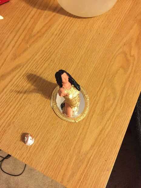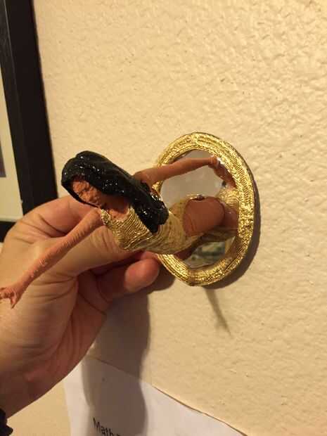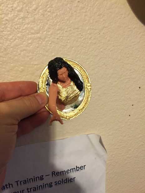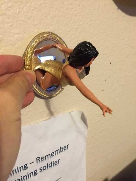 Después imprimí fuera del marco del espejo mágico, mi hija de 6 años quería ayudarme a pintar. Luego ella decidió que quería tener otro torso y espejo en su dormitorio junto a su espejo regular. Así, terminó para arriba y lo colgó en su habitación. Necesaria alguna masilla pegajosa para colgar así que sería plana contra la pared.