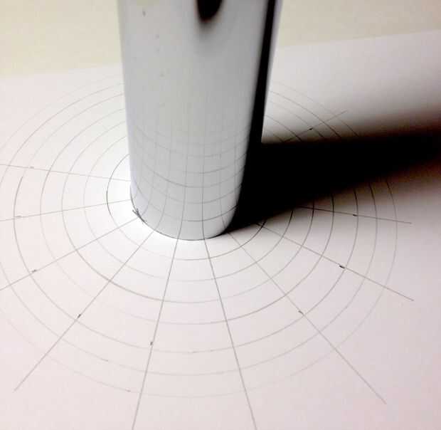 Hay distorsión visible donde el espejo se encuentra en el pedazo de papel; Esto es porque el concéntrico círculo y radial red línea es no exactamente correcta (matemáticamente) abajo cerca del punto de contacto con el espejo. Vamos a mantener nuestro arte lejos de esta región de distorsión.