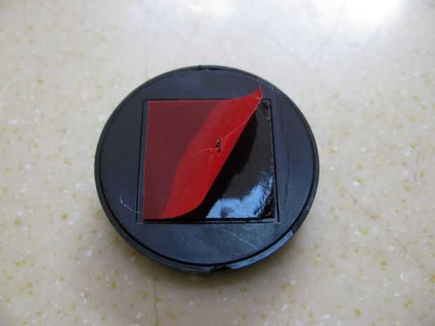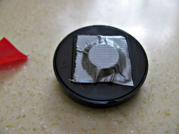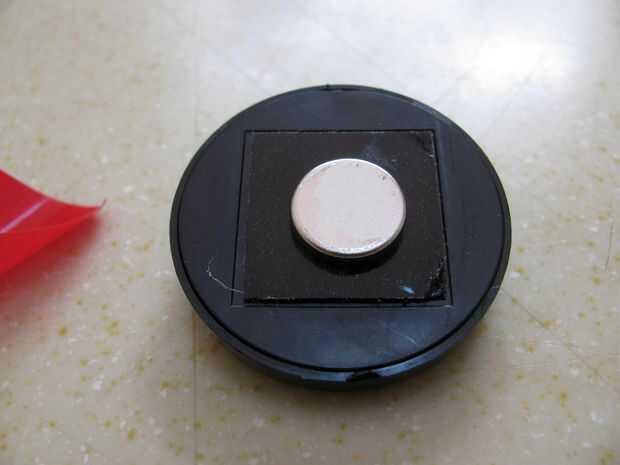 Retire el adhesivo protector que cubre desde la parte posterior del espejo. Un imán de neodimio (potente) de la planta en el centro de la zona adhesiva. Cubre el imán adhesivo área y con un pedazo cuadrado de cinta adhesiva.