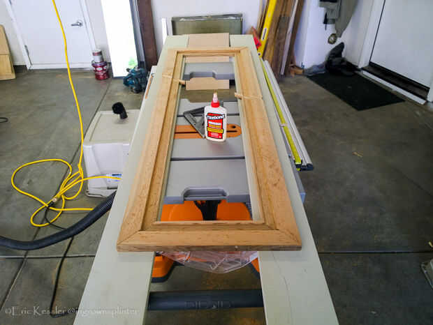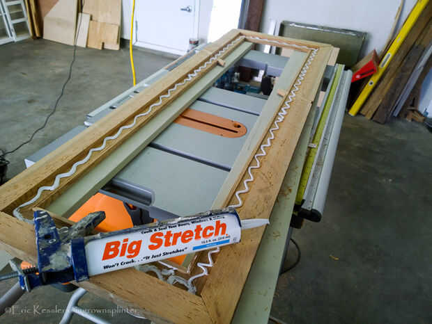 Usando pegamento de madera y unos tornillos de acabado en cada esquina, que montado el marco. una vez construido, he apoyado el marco a su cara y llenó la dado una gota generosa de sellador "big stretch". líquido uñas o cualquier otro tipo de adhesivo de construcción funcionaría bien para este paso, sin embargo tenía este tubo de calafateo, sobrado de otro trabajo y una vez seca la masilla fue tan eficaz como cualquier pegamento habría sido.