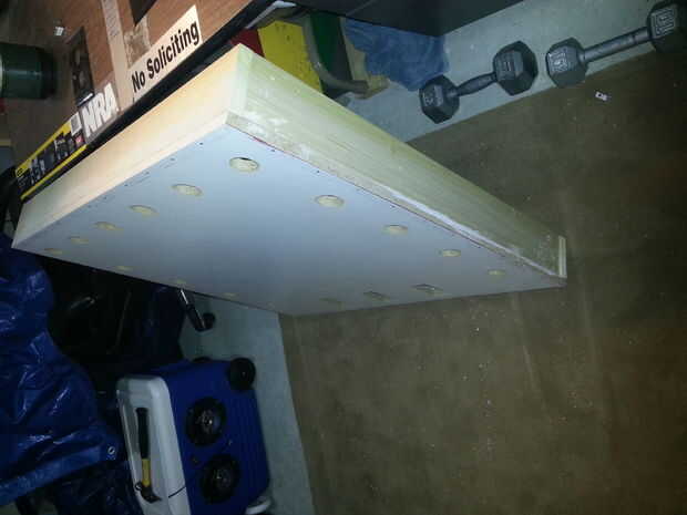 para fijar el marco primero necesita a pre marcar los orificios por donde va a taladrar los agujeros para el clavar el tablero superior a la estructura. el marco es 1'' para medir en el borde 1/2 pulgada y dibujó una línea en el borde. Marque los agujeros 3 pulgadas aparte. antes de taladrar los orificios pre pegar el marco a la junta superior y wieghts en que mantienen unida. una vez la dryed pegado pre-perforados los agujeros para los clavos. Entonces clavó en las uñas donde marqué los agujeros previamente perforados.