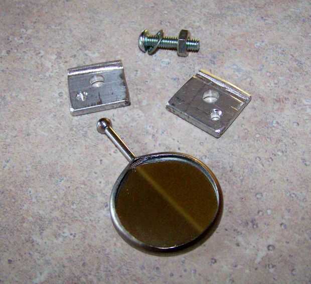 Las plazas de aluminio necesitan dos juegos de agujeros. Un sistema forma un zócalo para la bola giratoria en el espejo. (El resto del espejo como vino de la tienda no se utiliza.) Perfore un agujero un poco menos de diámetro de la bola giratoria. Vestido y montar con un poco de avellanado. Perfore otro agujero para el tornillo de sujeción.