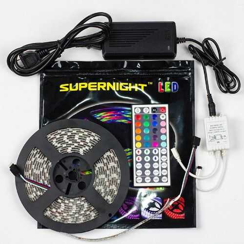 Este kit viene con un adaptador de corriente, control remoto, sensor de infrarrojos y 16,4 pies de tira del LED con forro adhesivo para alrededor de $30. Los LEDs pueden recortarse cada 1.5 pulgadas o 3 pulgadas dependiendo de que juego es que. Recomiendo conseguir sus LEDs de Amazon u otro distribuidor en línea, como tiras de Home Depot y de Lowe's carga una prima considerable por su luz.