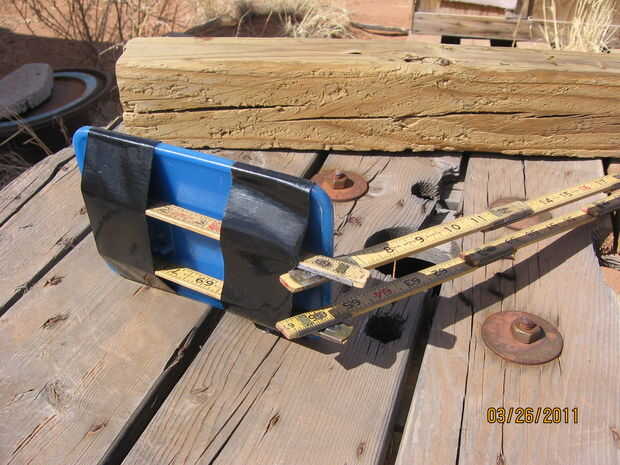 un pequeño espejo, regla plegable de un carpintero y cinta de pato son todo lo que necesitaba para darme un espejo en un palo. La herramienta improvisada monta en dos minutos, el ángulo largo y espejo son ajustables, y las piezas pueden volver a sus propósitos originales después. He encontrado de gran ayuda para verificar el nivel de ácido de batería en la fila de atrás de mis pilas de la casa, una tarea habitual para cualquier persona que use energía solar fuera de la red. Estoy pensando que puede ser útil para un número de otros propósitos.