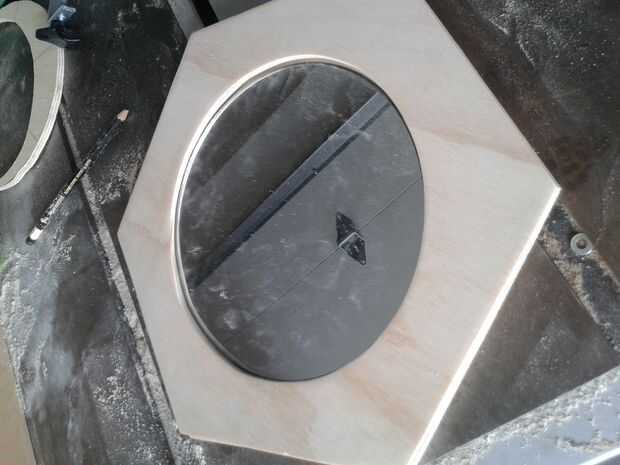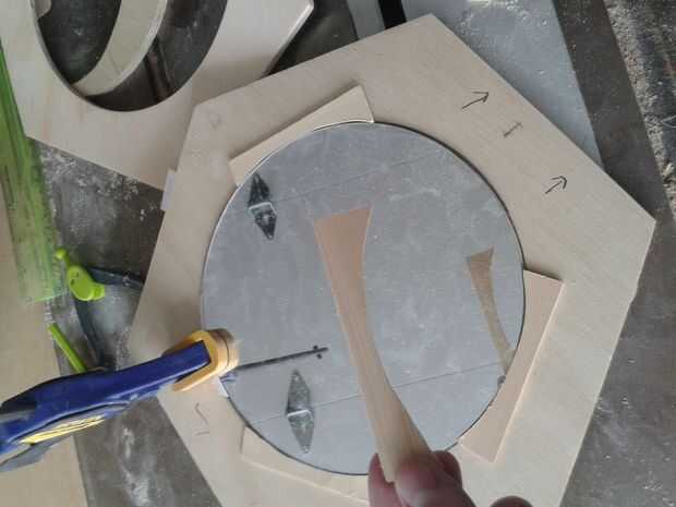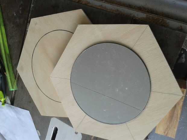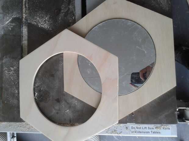 En ambos de estos hexágonos me coloca el espejo en el centro exacto y trazada alrededor de él. Para la parte delantera me perforó un agujero en este trazado y utilizar una sierra de calar con la hoja colocada a través del orificio para recortar el círculo. En la cara posterior pegué el espejo donde el círculo había sido rastreado (fotografiado) con pegamento PVA.