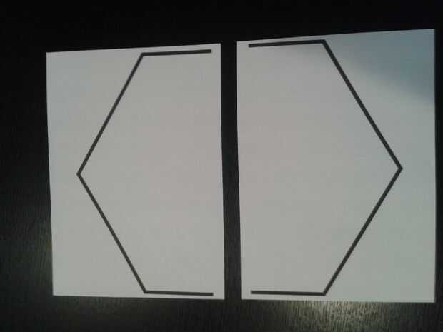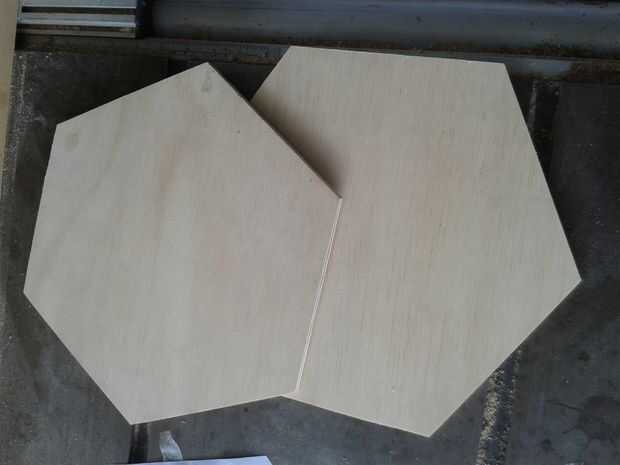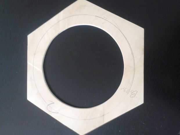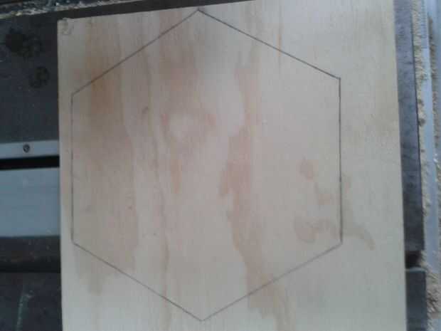 En primer lugar que imprimí un hexágono era lo bastante grande como para acomodar el espejo unidireccional con espacio libre adicional izquierda para pegar los lados en. Después de trazó la forma en planchas finas de madera dos veces y cortar tanto utilizando una sierra de contornear. Luego elegí un hexágono que la parte delantera y el otro a la cara posterior.