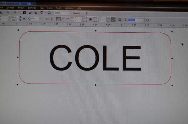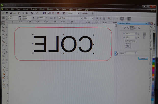 Dentro de ese rectángulo, escriba el texto deseado en negro. Usted necesitará probar tamaños de fuente diferentes hasta encontrar uno que encaja perfectamente dentro de la altura del rectángulo. Una vez que se ha escrito en el texto, necesita reflejar el texto para que se girarán a la derecha e izquierda. Esto es necesario ya que vamos a grabar la parte de atrás del espejo acrílico, por lo que el texto se verá por el lado que está hacia abajo cuando estamos realizando el grabado.